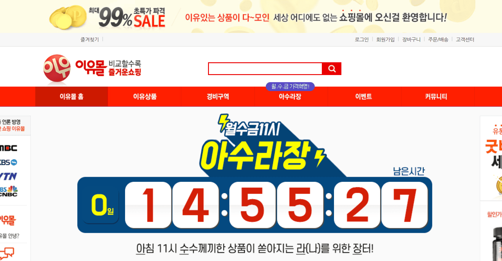 이유몰의 가장 큰 백미는 바로 월요일, 수요일, 금요일 오전 11시에 오픈되는 '아수라장' 특가 코너입니다. 이곳에서 50% 이상의 초특가 상품들이 쏟아지기 때문에 많은 알뜰 쇼핑객들이 기다리는 시간이죠!